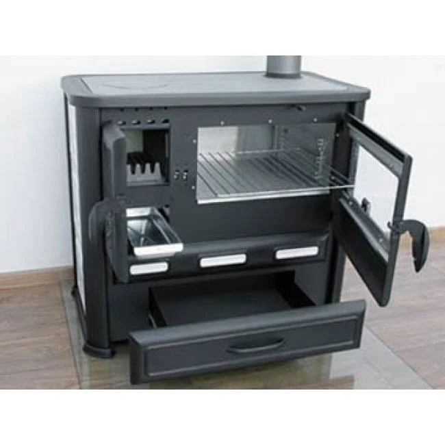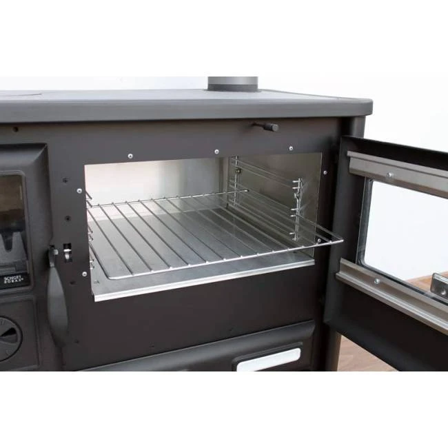 La cuisinière à bois Alma Mons est une cuisinière élégante et rustique en fonte grise. Elle est disponible dans plusieurs versions pour la sortie des fumées : sur le dessus ou à l’arrière de l’appareil, à gauche ou à droite.