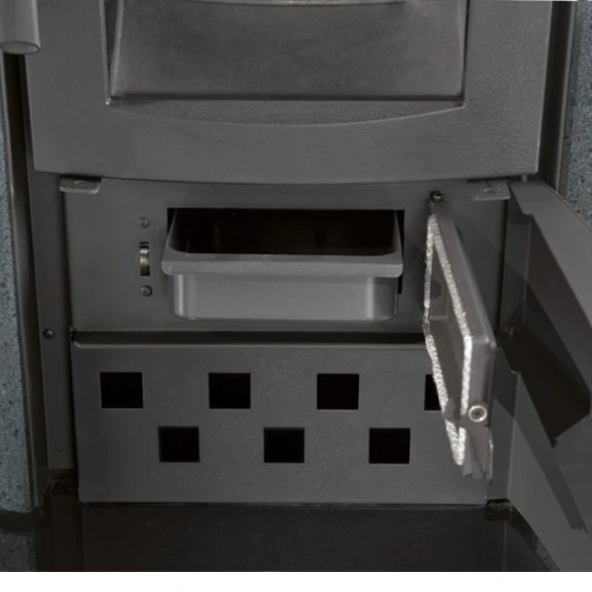 Le poêle à bois Ester BII dispose d’excellentes finitions. Le revêtement intérieur du foyer et la porte sont en fonte. La vitre est en céramique pour assurer une excellente résistance aux hautes températures. Les façades extérieures du poêle à bois sont en pierre naturelle.